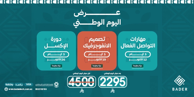 Coinciding with the celebrations of the Saudi National Day 2025, Bader Technology Center is pleased to offer a unique training package that includes three integrated courses in high-demand fields in the labor market, at special prices worthy of this precious occasion.